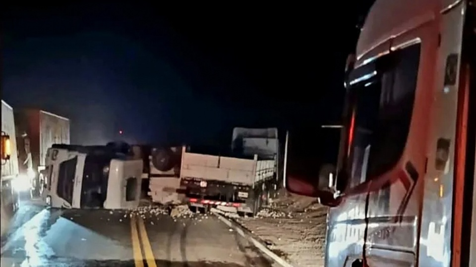 Un fuerte accidente entre dos camiones se registro a última hora de anoche en la ruta nacional 7, a unos 3 kilometro del ACI de Uspallata, donde uno de los rodados chocó a otro en su costado, provocando que este ultimo volcara sobre el asfalto.